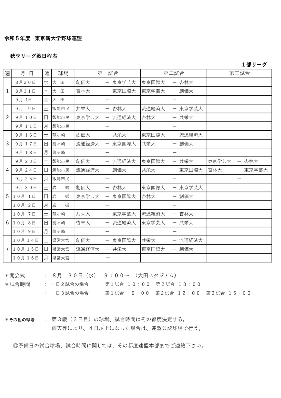 令和5年度 Ⅰ部秋季リーグ戦に関しまして、日時及び会場が決定しましたのでお知らせいたします。
