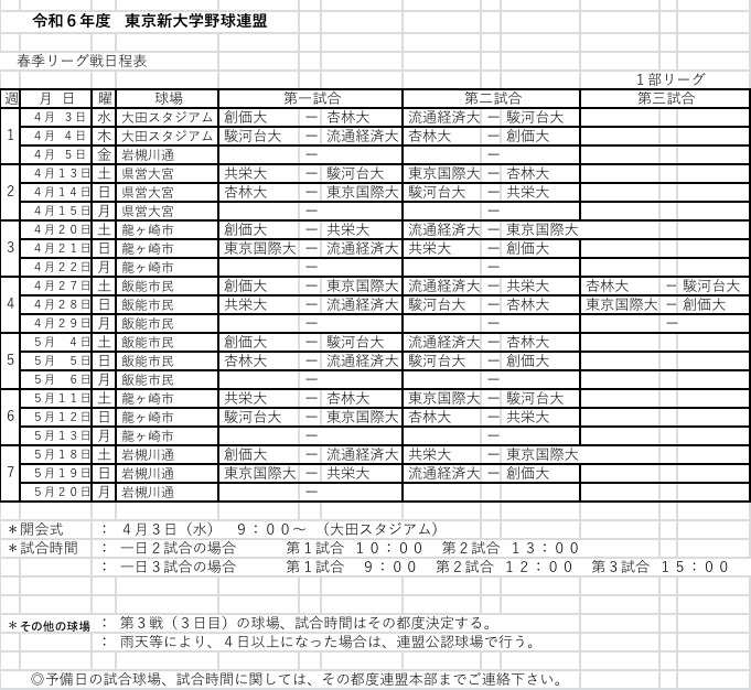 令和6年度春季1部リーグ戦の日程を公開いたします。